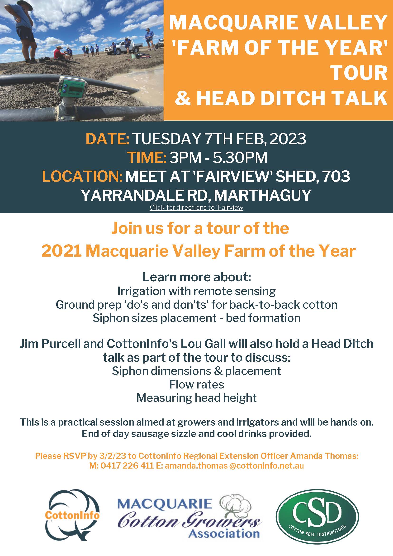 Join us for a tour of the 2021 Macquarie Valley Farm of the Year and Head Ditch Talk on Tuesday 7th of February 2023. Full details in flyer below. Date 07/02/2023 Location Marthaguy, NSW Image