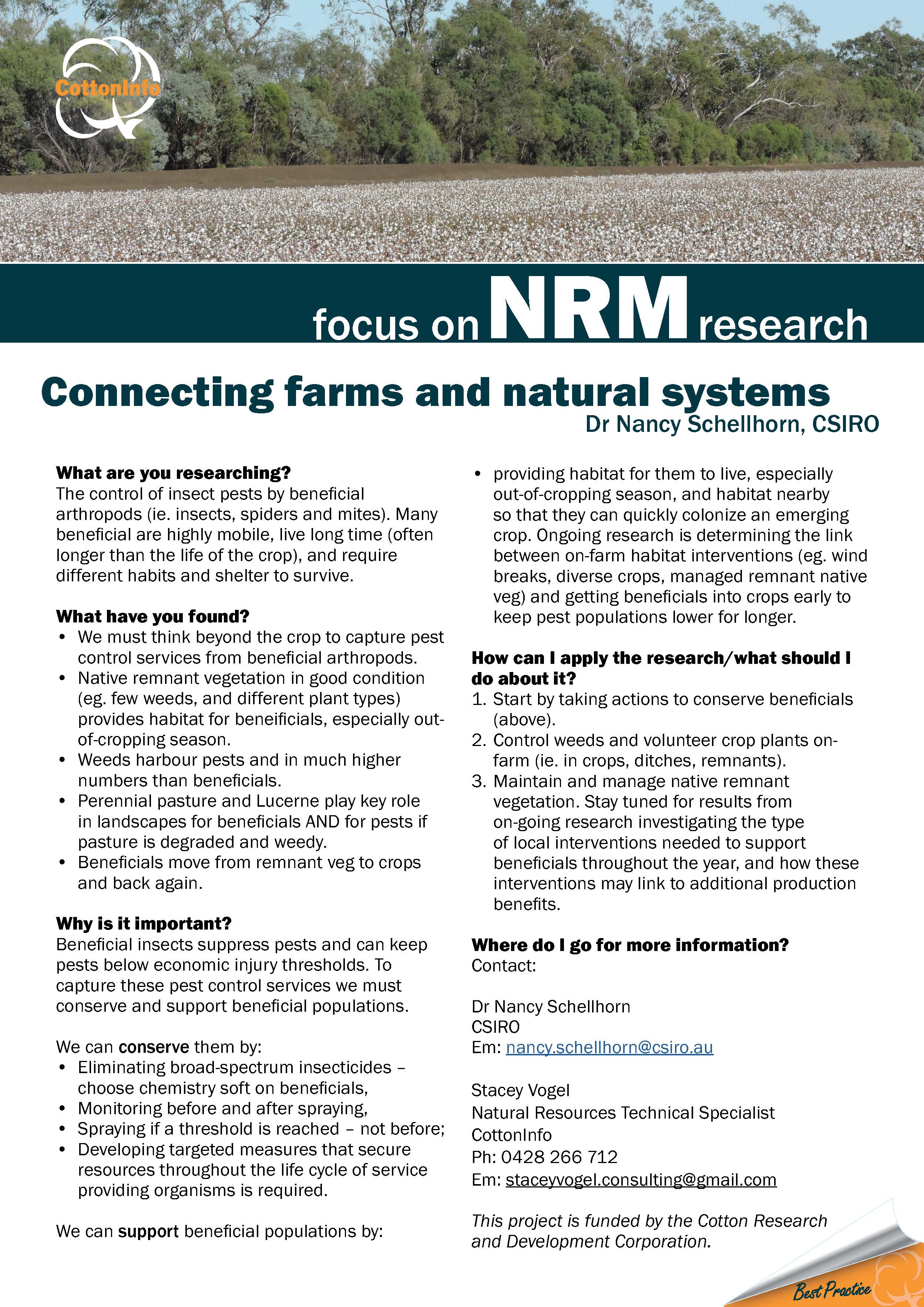 The Focus on NRM research series introduces you to the key cotton NRM researchers and their work. In this case study, Dr Nancy Schellhorn introduces her research into the contorl of insect pests by beneficial arthropods (ie. insects, spiders and mites).