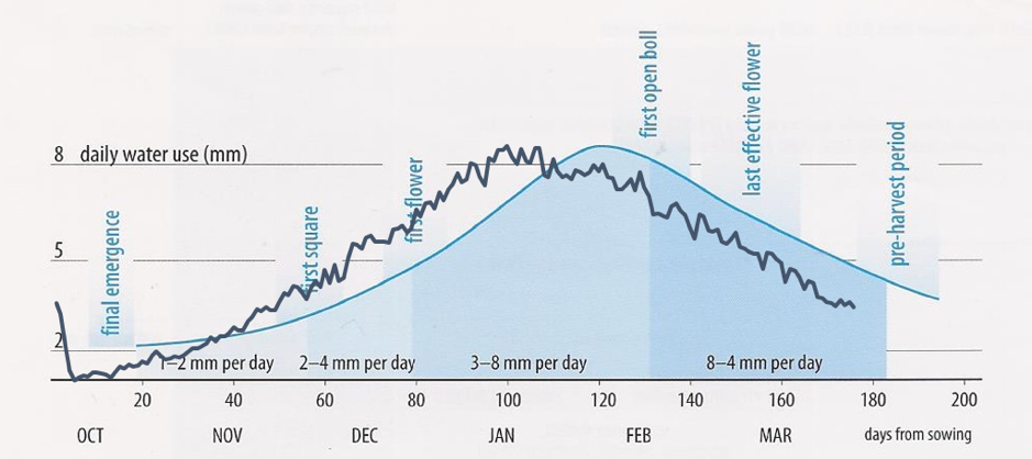 We may have no choice if we are planting on rainfall. However, ideally the later in the planting window the better (within reason we need to make sure we finish that crop off). Planting later in the window enables us to take advantage of the summer storms in January/February period but it’s also taking that critical boll fill and flowering period out of that heat of that December January. However, establishing these crops on rainfall is where we make some big savings in terms of water.