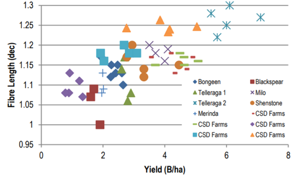 The relationship between yield and fibre quality in dryland cotton is shown in figure 2. This is the summary of 12 dryland row configuration trials conducted by the CSD Extension and Development team since 2006. The upper points of each set of individual data are a result of a wider configuration. Please note that, within many cases in these trials, the final yield was not significantly affected by the choice of row configuration.