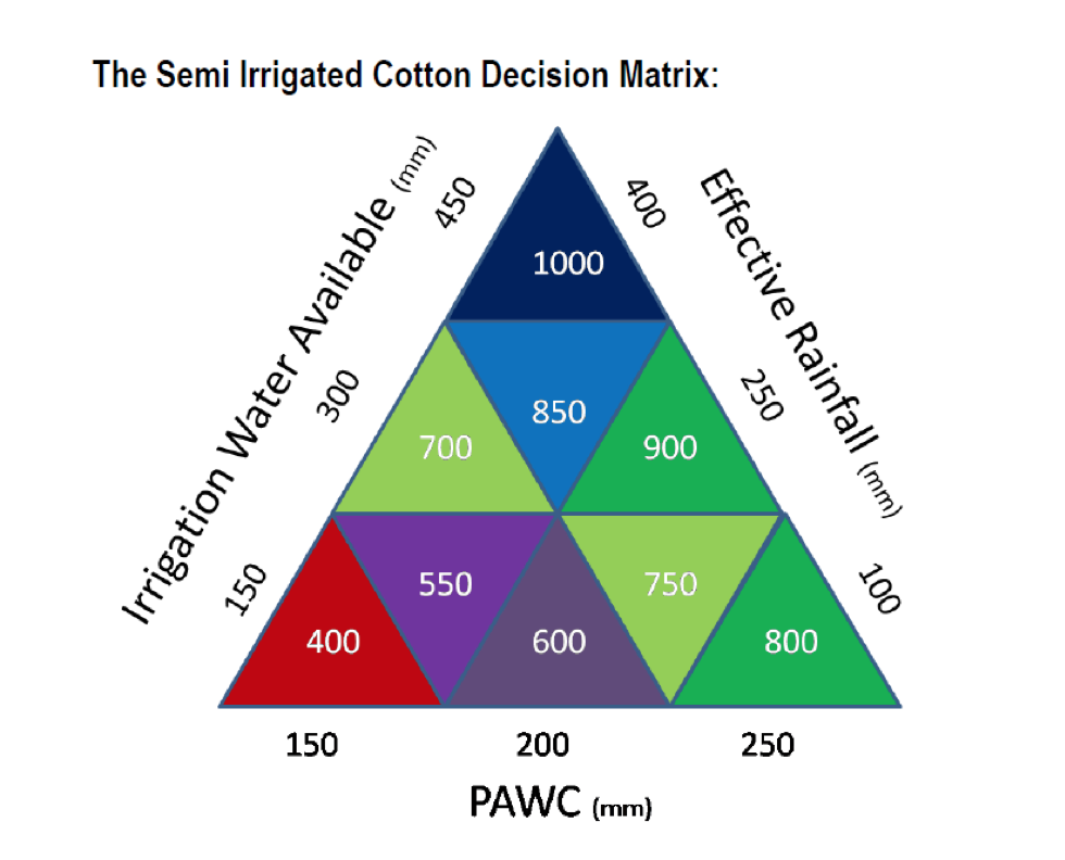 Yes, CSD’s Semi irrigated row configuration decision matrix (Figure 2). We need to get at least 800mm water through the cotton plant (crop evapotranspiration (ETc)) to reach its full yield potential. There are three water sources that can make up this 800mm: