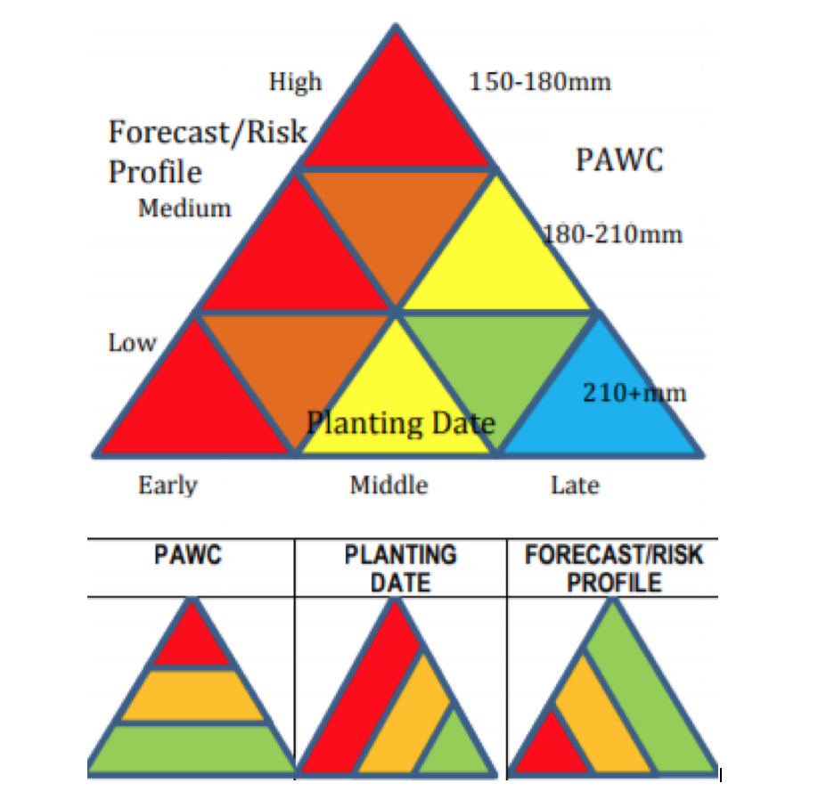 There are several considerations which may influence the selection of a row configuration, including soil Plant Available Water Holding Capacity (PAWC), planting date and the seasonal forecast or risk profile. Select the optimal configuration by considering and overlaying these factors, but remember it has to fit into existing tractor wheel bases and picking technologies available.