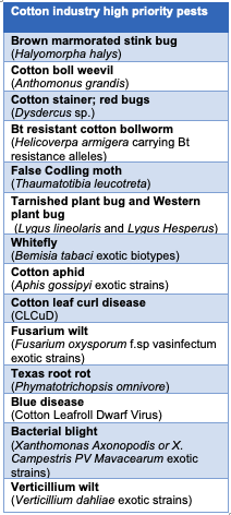 There are 15 high priority pest and disease threats for Australian cotton production.