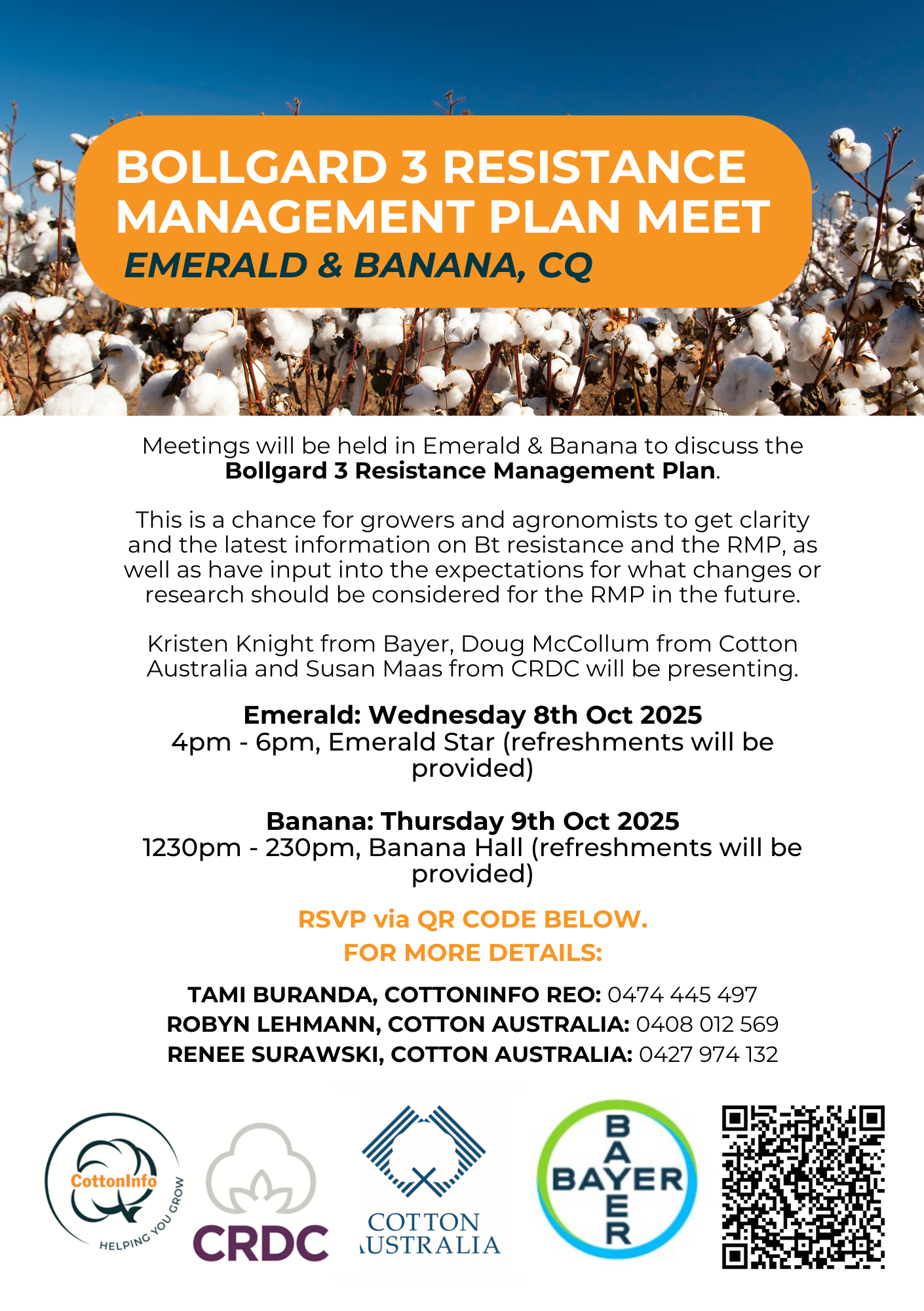 Meetings will be held in Emerald (Oct 8) and Banana (Oct 9) to discuss the Bollgard 3 Resistance Management Plan.Details in flyer below. Date 09/10/2025 Location Banana CQ Image