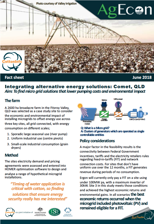 The case study, conducted by AgEcon/CottonInfo's Jon Welsh and AgEcon's Janine Powell, was undertaken to consider the economic and environmental impact of installing microgrids to offset the energy use of surface water irrigation pumps and a small grain drying facility in the Fitzroy Valley