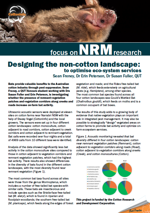 The Focus on NRM research series introduces you to the key cotton NRM researchers and their work. In this case study, Sean Freney, Dr Erin Peterson, Dr Susan Fuller outline their research into the impact of remnant vegetation on bat activity.