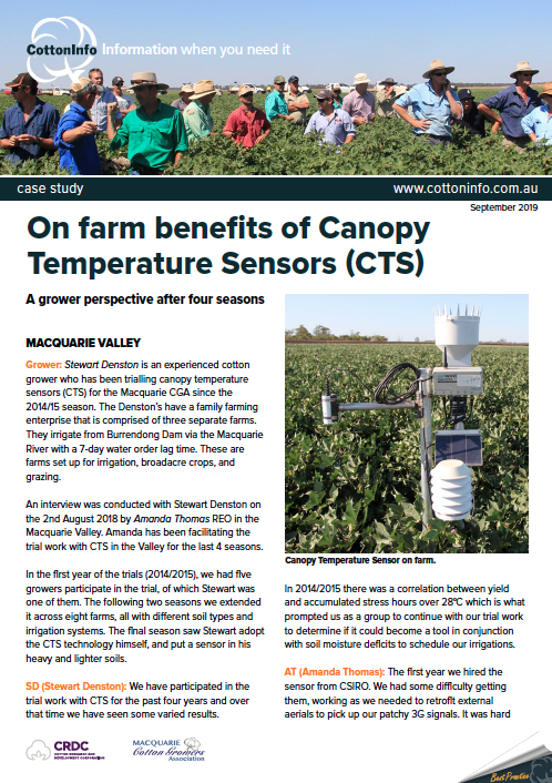Stewart Denston is an experienced cotton grower who has been trialling canopy temperature sensors (CTS) for the Macquarie Cotton Grower Association (CGA) since the 2014-15 season, including installing his own sensors in both heavier and lighter soils.