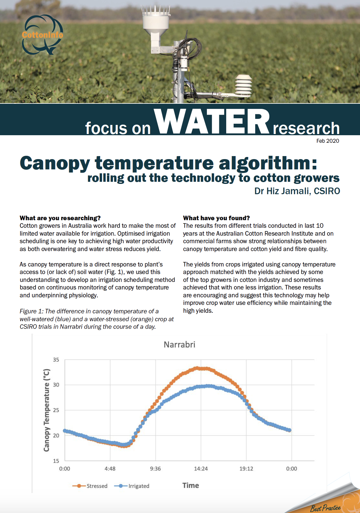 The Focus on water research series introduces you to the key cotton water researchers and their work. In this case study, Dr Hiz Jamali from CSIRO explains the roll out of the canopy temperature sensor algorithm in technology to cotton growers.