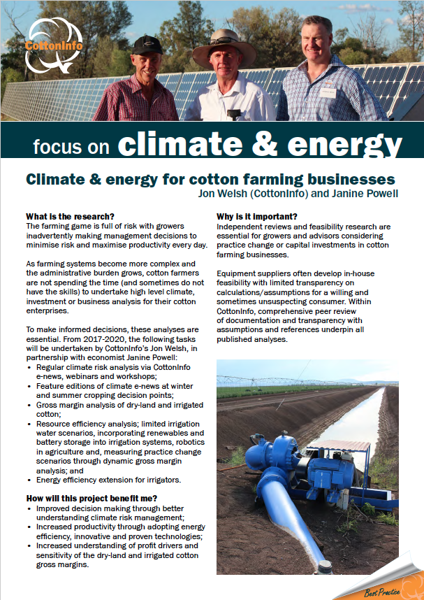 This project summary outlines the CRDC-funded Climate and energy for cotton farming businesses project, run by CottonInfo's Jon Welsh and economist Janine Powell from 2017-2020.