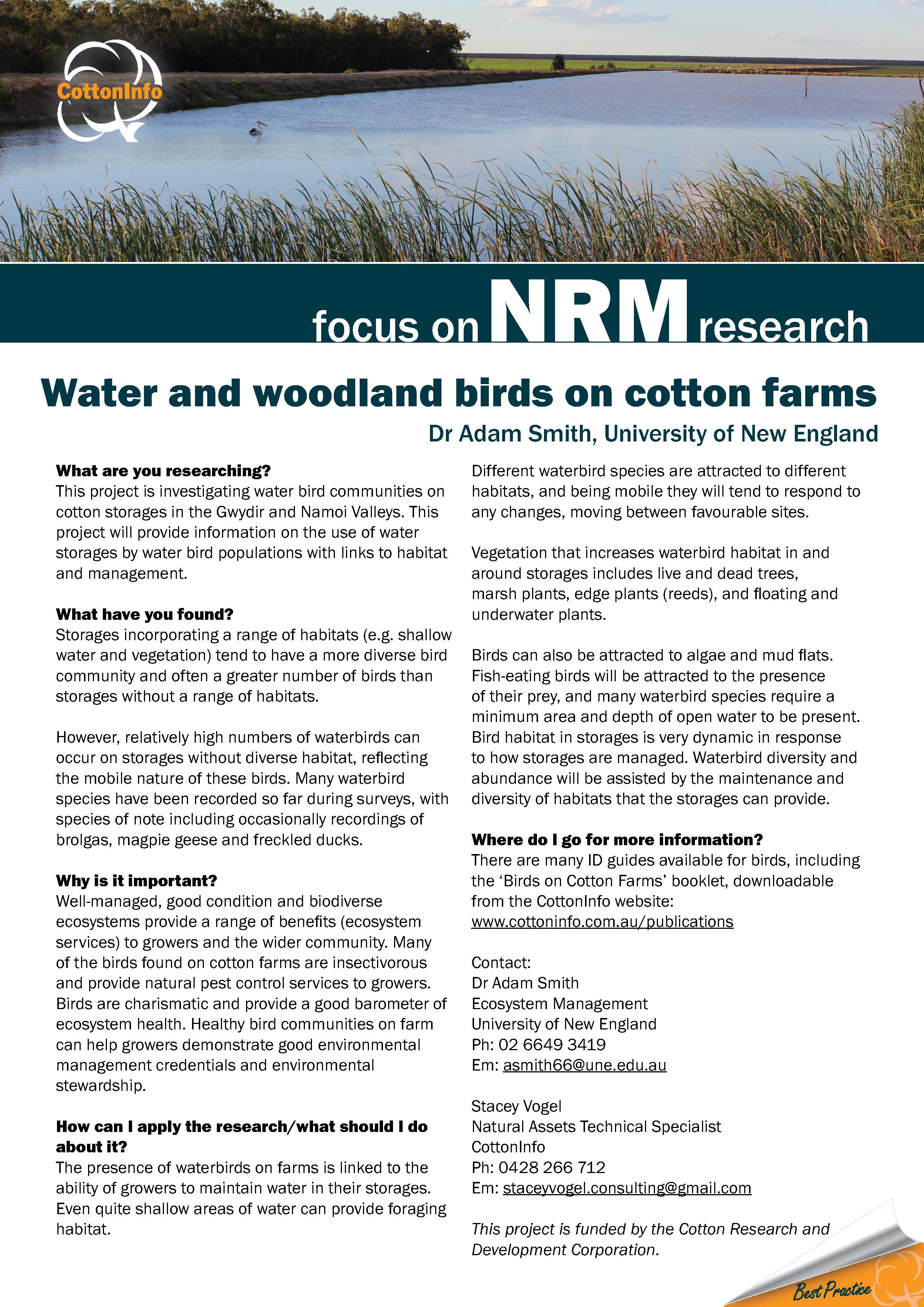 The Focus on NRM research series introduces you to the key cotton NRM researchers and their work. In this case study, Dr Adam Smith outlines his research into water bird communities on cotton storages in the Gwydir and Namoi Valleys.