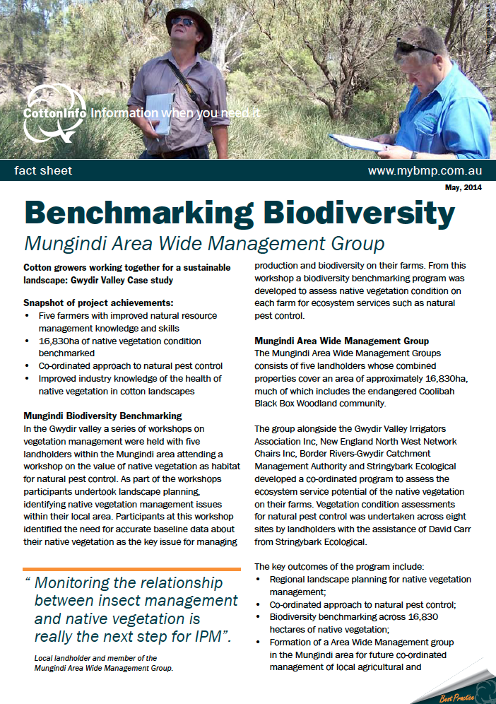 Under the 'Cotton growers working together for a sustainable landscape' project, a series of case studies have been developed. This case study outlines the work of the Mungindi Area Wide Management Group in benchmarking biodiversity.