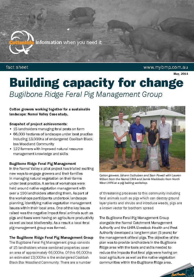 Under the 'Cotton growers working together for a sustainable landscape' project, a series of case studies have been developed. This case study outlines the work of the Bugilbone Ridge Feral Pig Management Group in managing feral pigs.