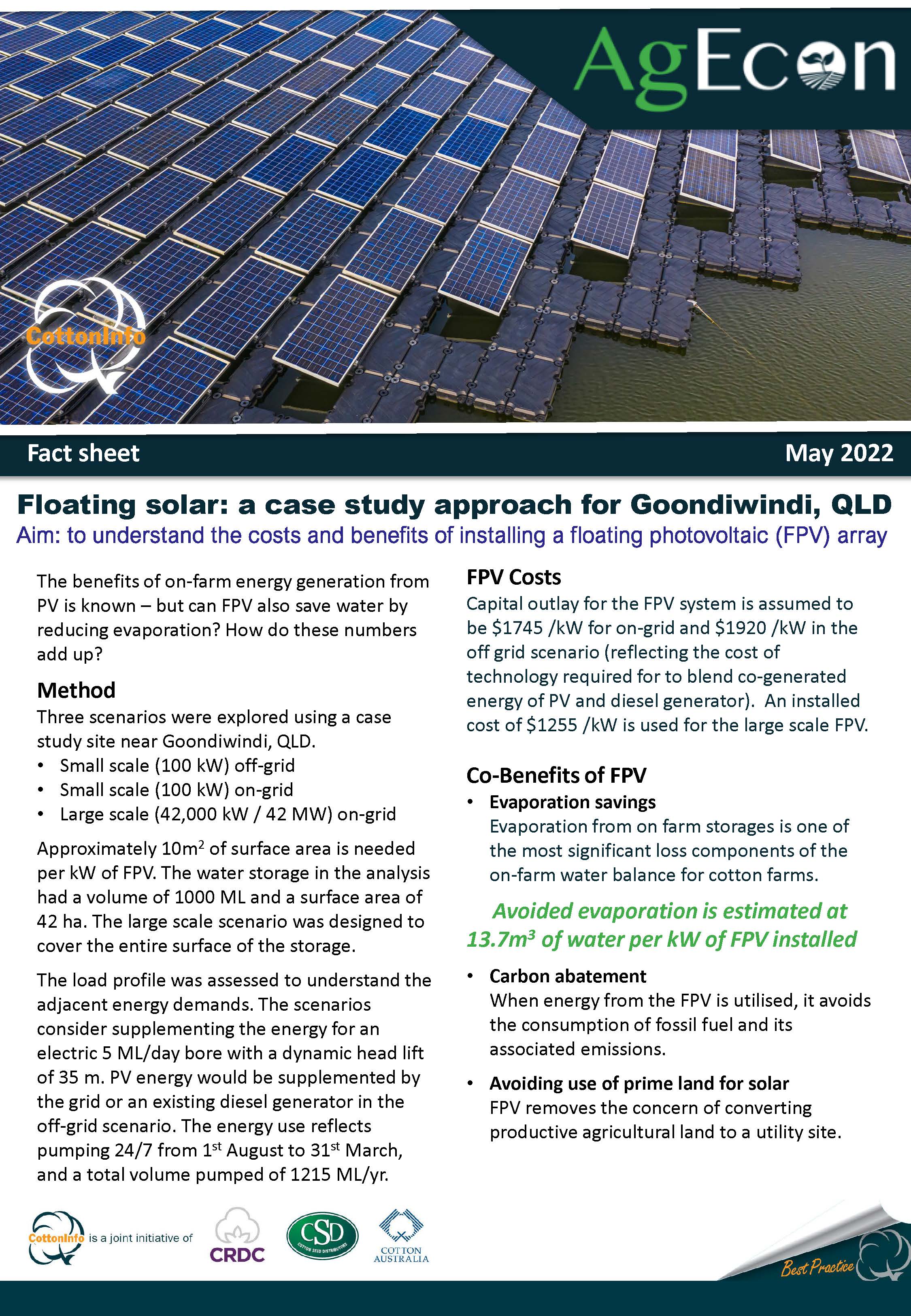 This fact sheet looks at the costs and benefits of installing a floating photovoltaic (FPV) array. Three scenarios are explored using a case study site near Goondiwindi, QLD.