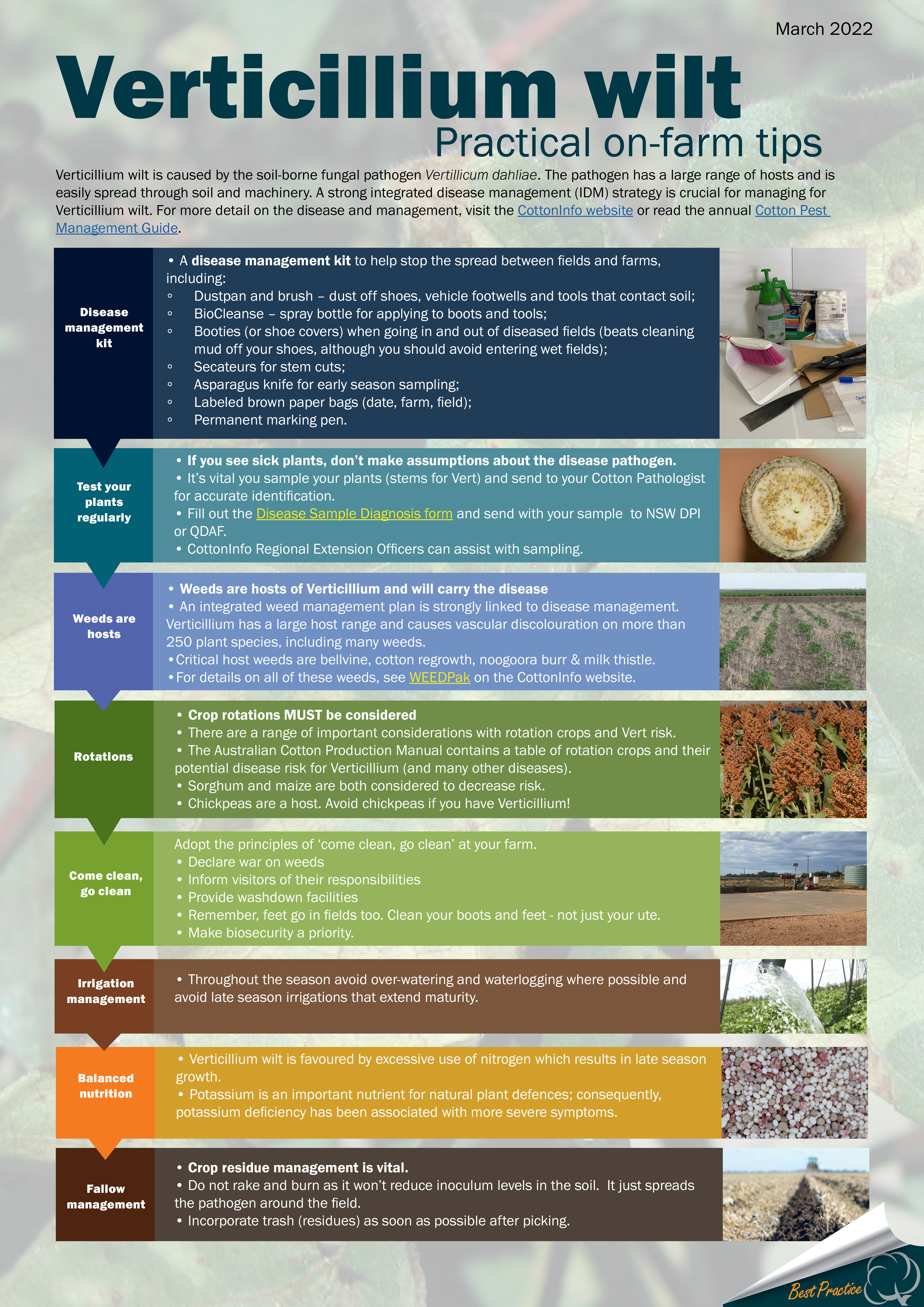 Verticillium wilt is caused by the soil-borne fungal pathogen Vertillicum dahliae. The pathogen has a large range of hosts and is easily spread through soil and machinery. A strong integrated disease management (IDM) strategy is crucial for managing for Verticillium wilt.