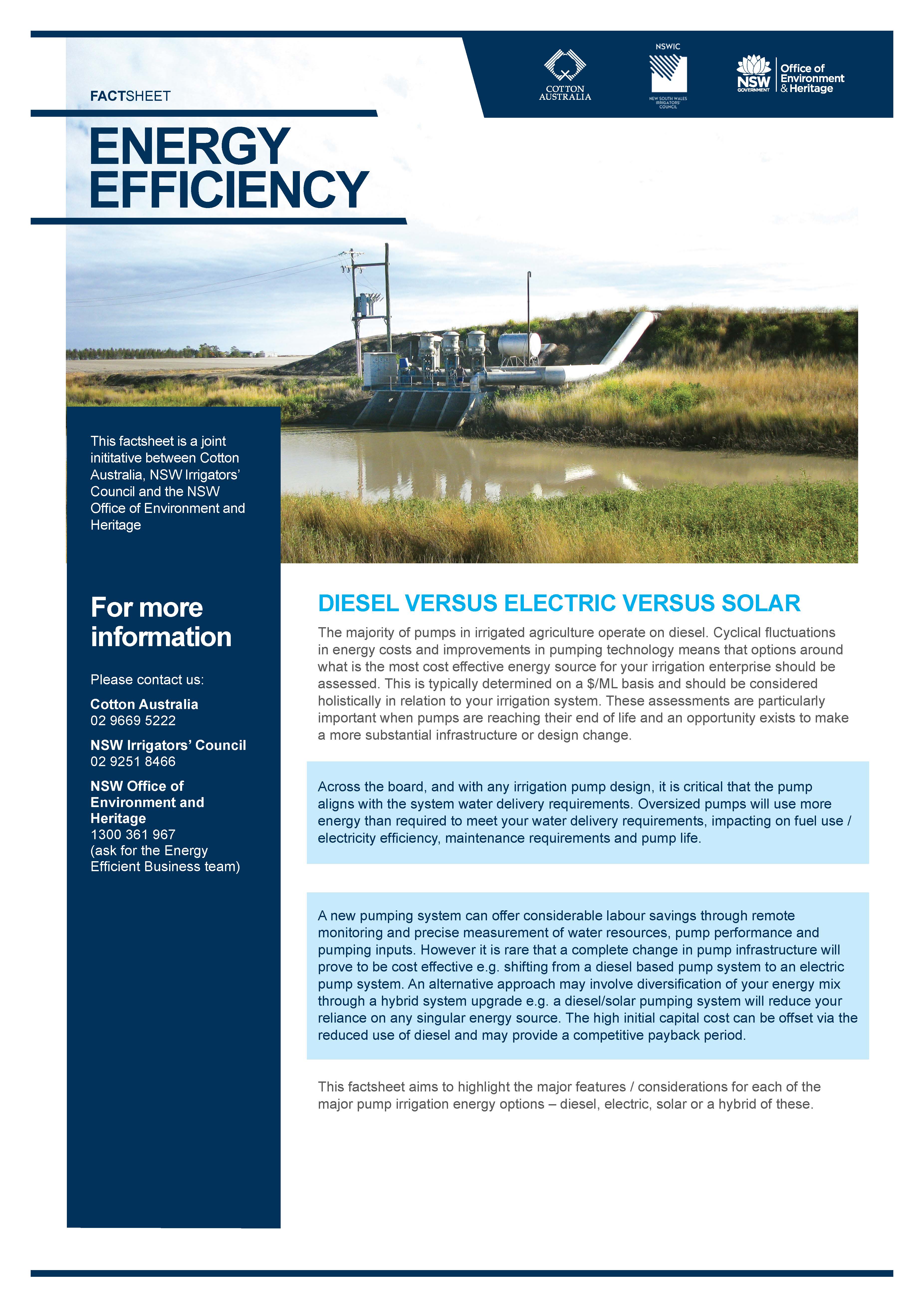 The majority of pumps in irrigated agriculture operate on diesel. Cyclical fluctuations in energy costs and improvements in pumping technology means that options around what is the most cost effective energy source for your irrigation enterprise should be assessed.