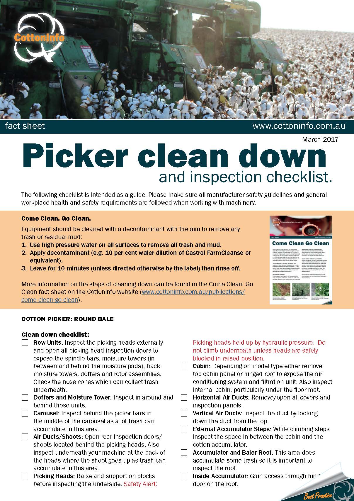 This cotton picker clean down checklist from CottonInfo is provided to growers and harvest contractors to assist in the prevention of the spread of pests, weeds and diseases.