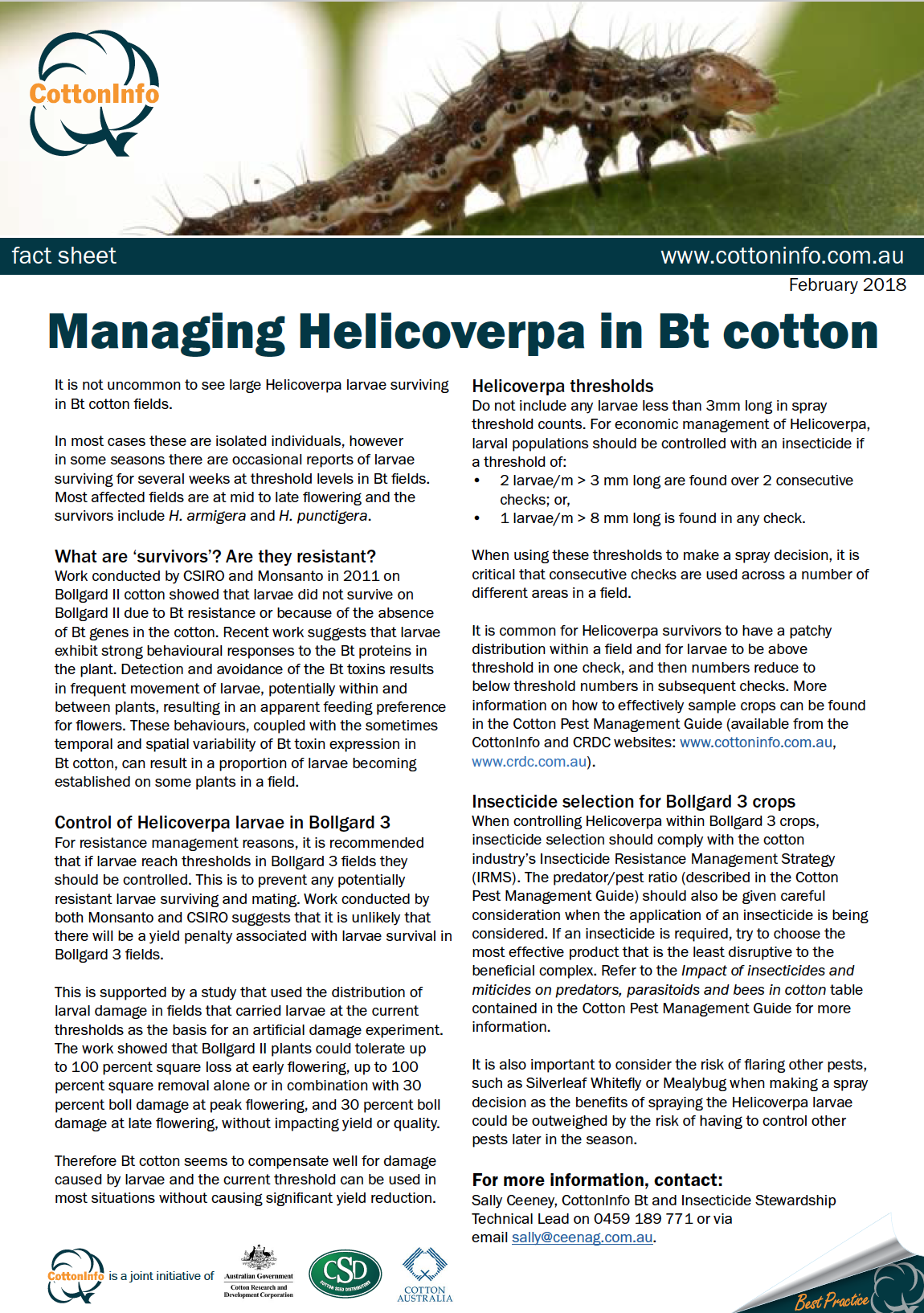 This fact sheet addresses the issue of Helicoverpa survivors (larvae larger than 3mm) in Bt cotton fields, and control methods available to growers.