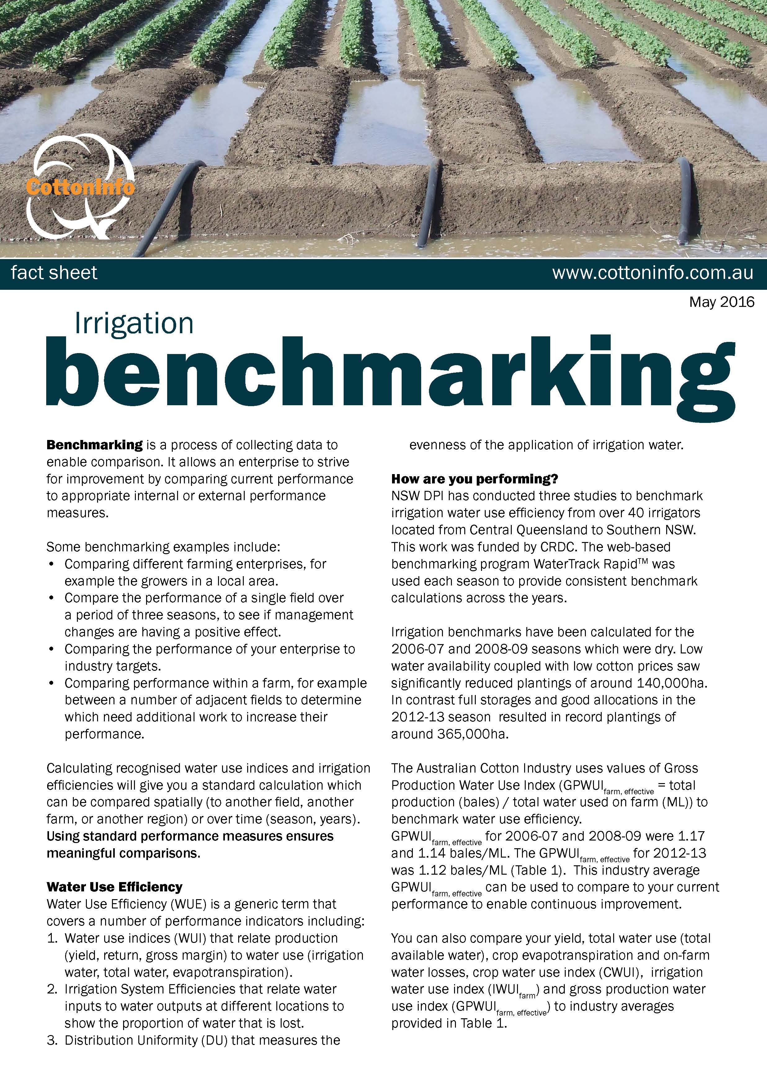 This fact sheet outlines how irrigation benchmarking can be used to gauge water use efficiency (WUE) performance. The two key WUE performance indicators are Irrigation Water Use Index (IWUI) and Gross Production Water Use Index (GPWUI).