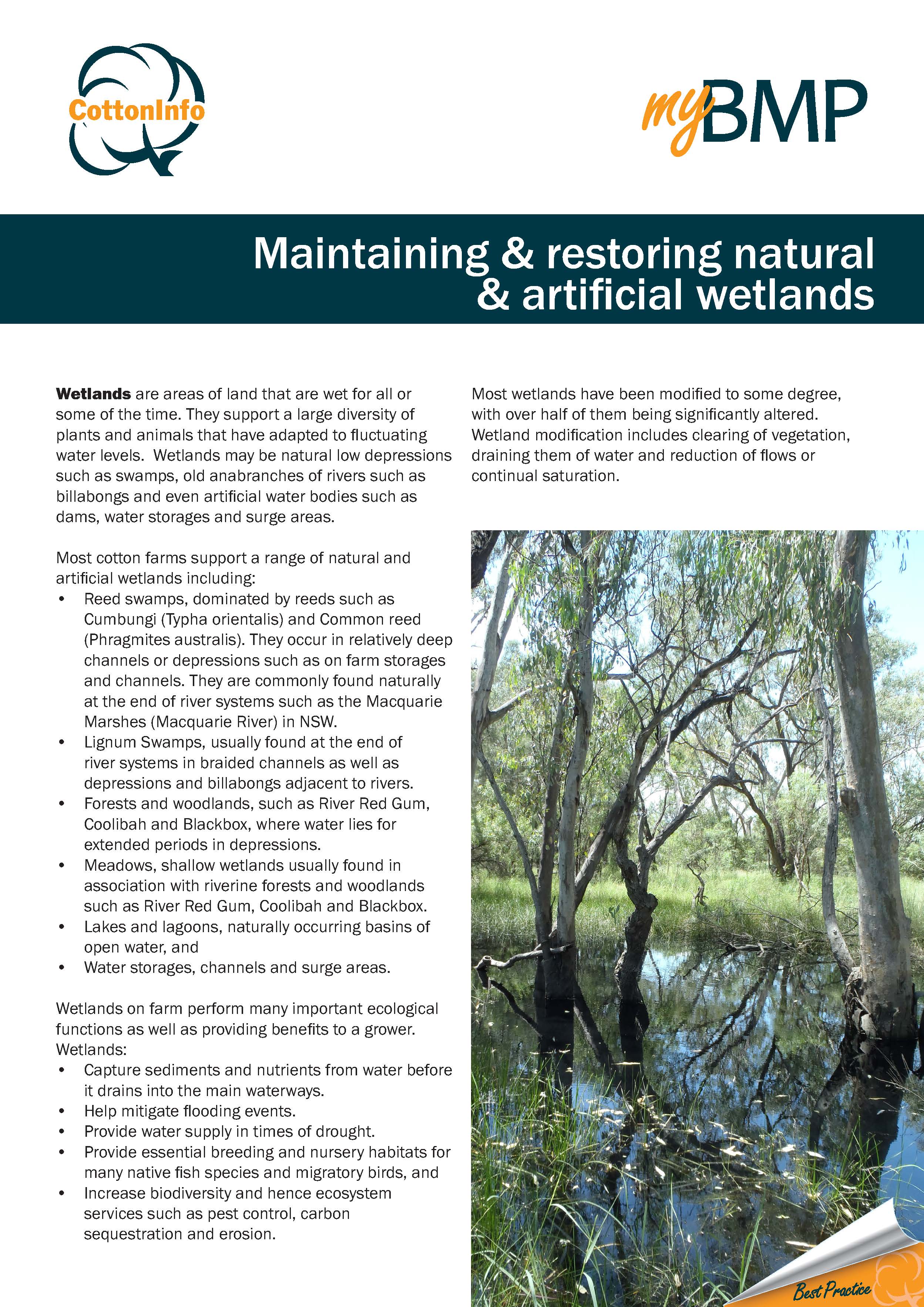 This fact sheet, from CottonInfo and myBMP's series of NRM best practice fact sheets, outlines how growers can maintain wetlands on their farms.