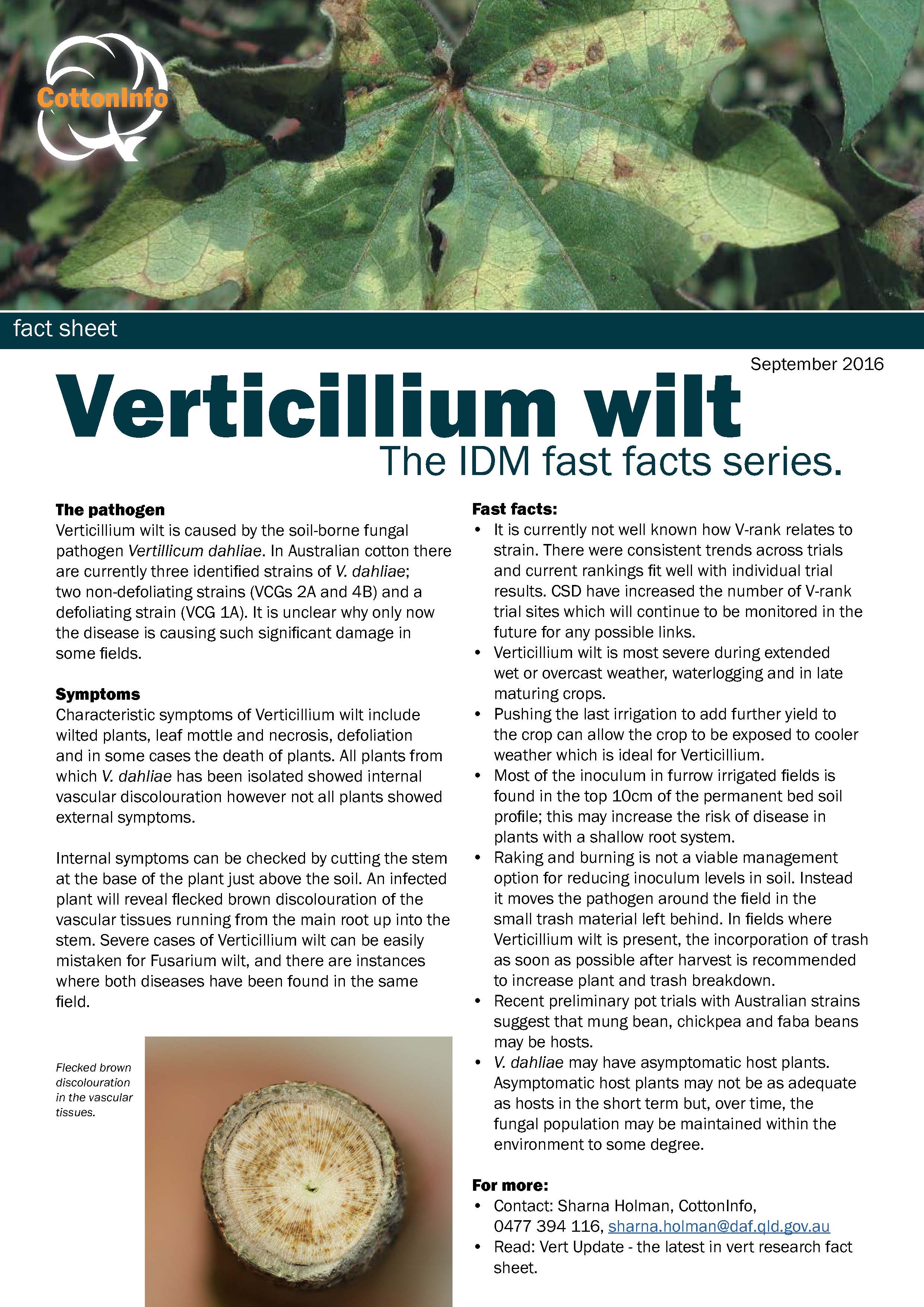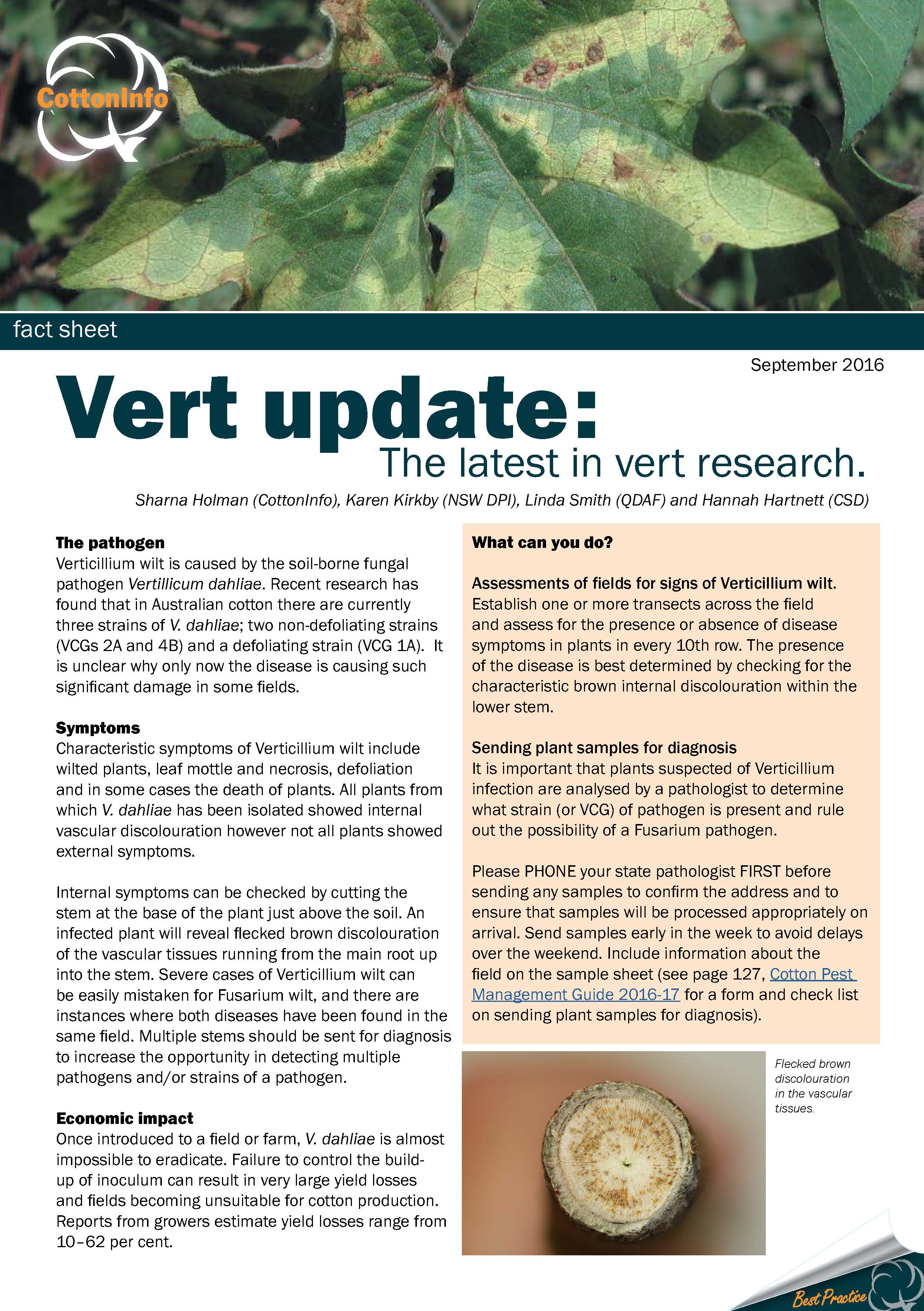 This fact sheet brings together the latest in verticillium research from the teams at NSW DPI and QDAF (supported by CRDC), plus CSIRO and CSD. Current: Sept 2016.