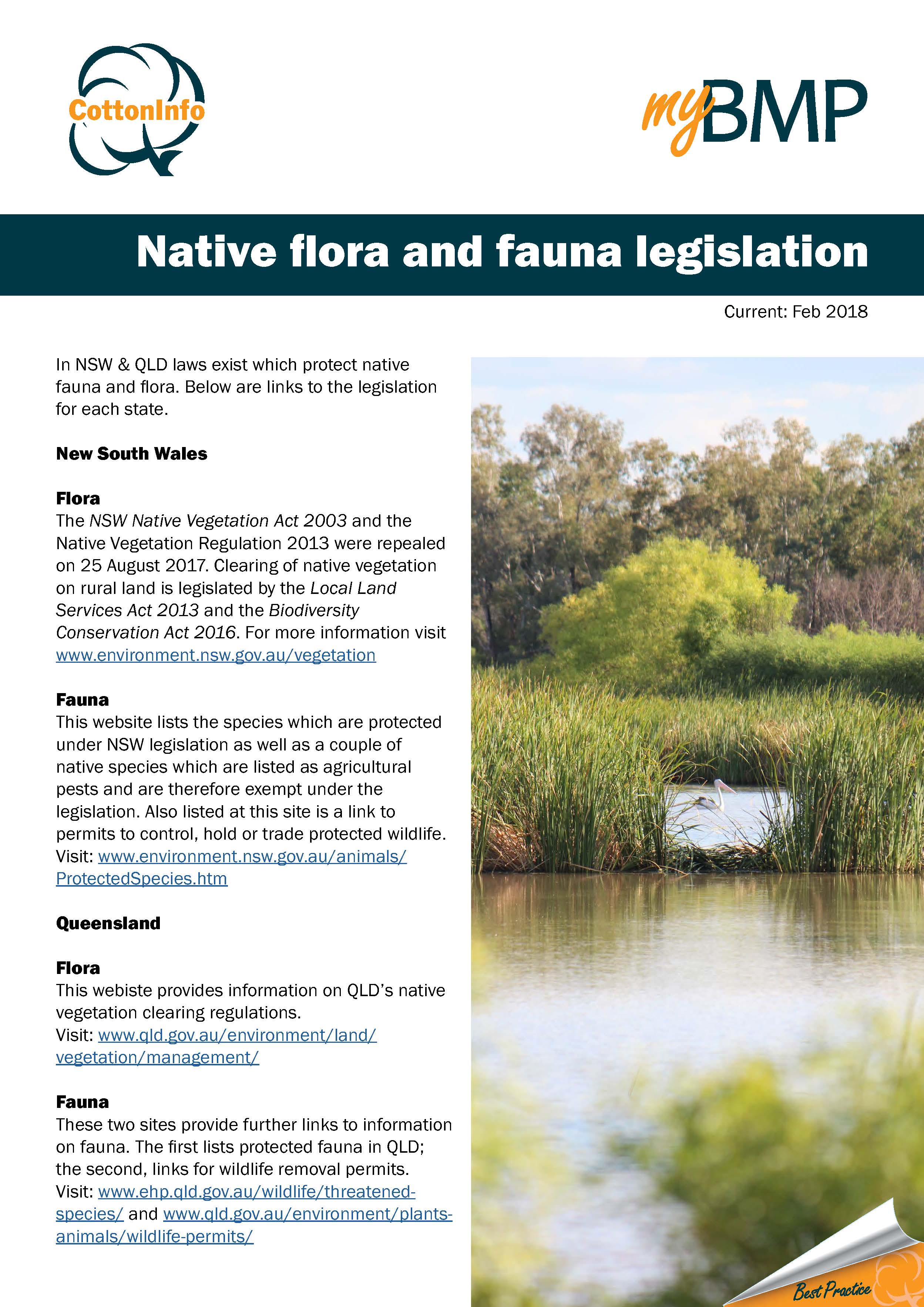 This fact sheet, from CottonInfo and myBMP's series of NRM best practice fact sheets, outlines the NSW and QLD flora and fauna legislation.