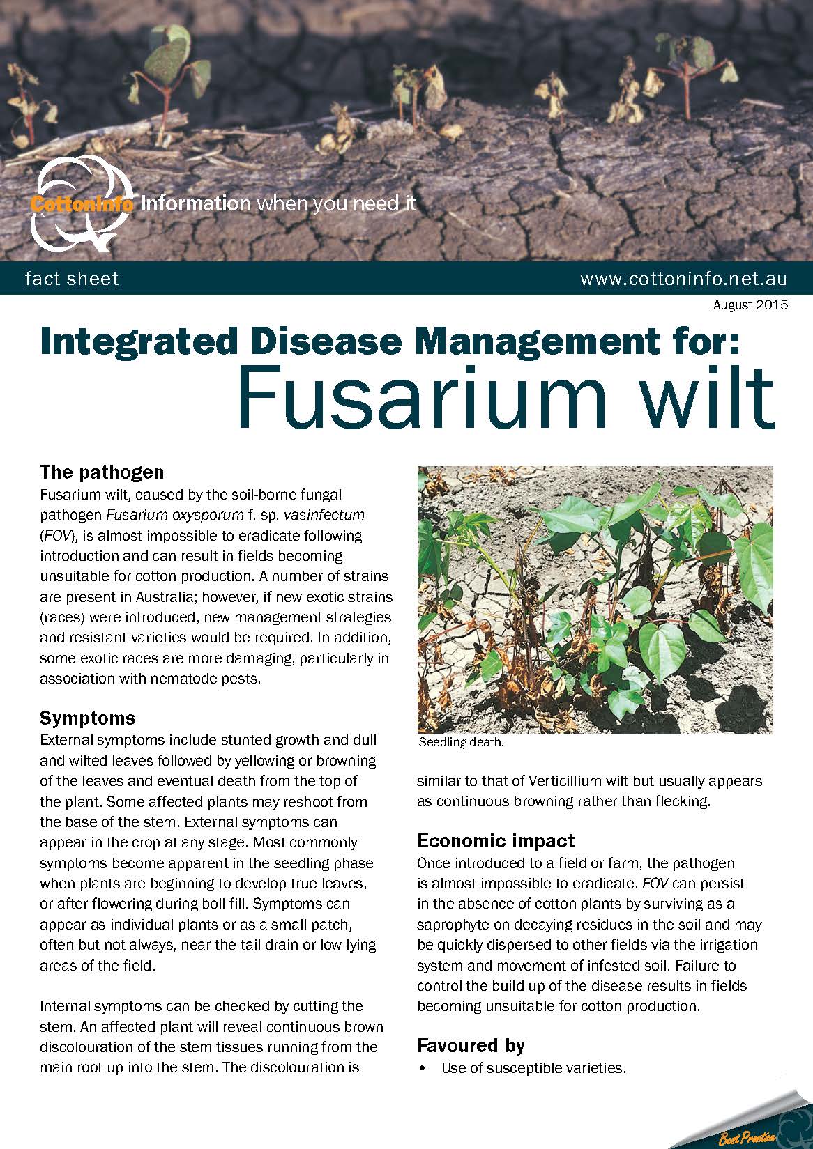 This fact sheet, one of the CottonInfo Integrated Disease Management (IDM) fact sheets series, looks at the IDM strategies to control fusarium wilt.