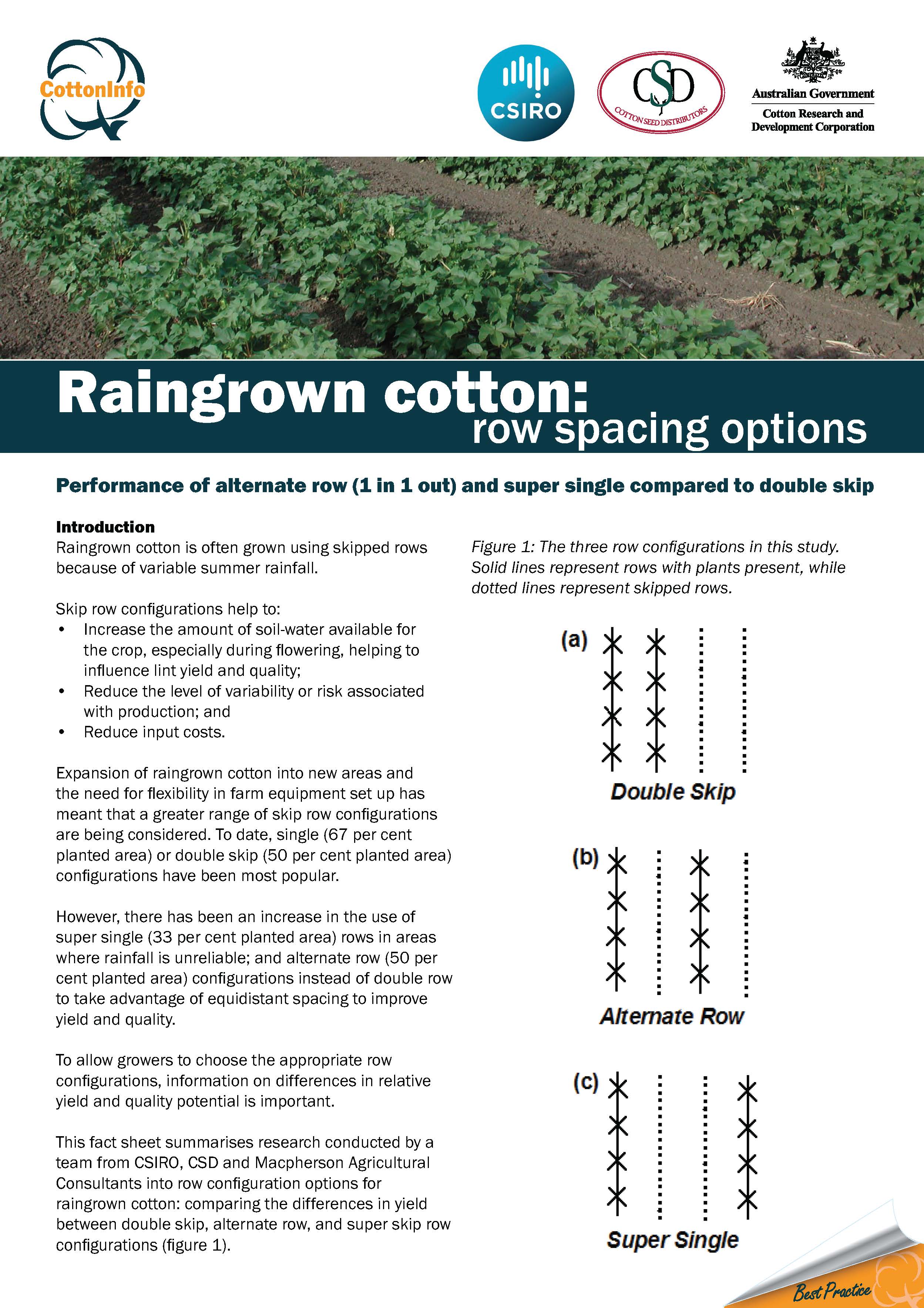 There has been an increase in the use of super single (33 per cent planted area) row configurations in raingrown cotton in areas where rainfall is unreliable; and alternate row (50 per cent planted area) configurations instead of double row to take advantage of equidistan
