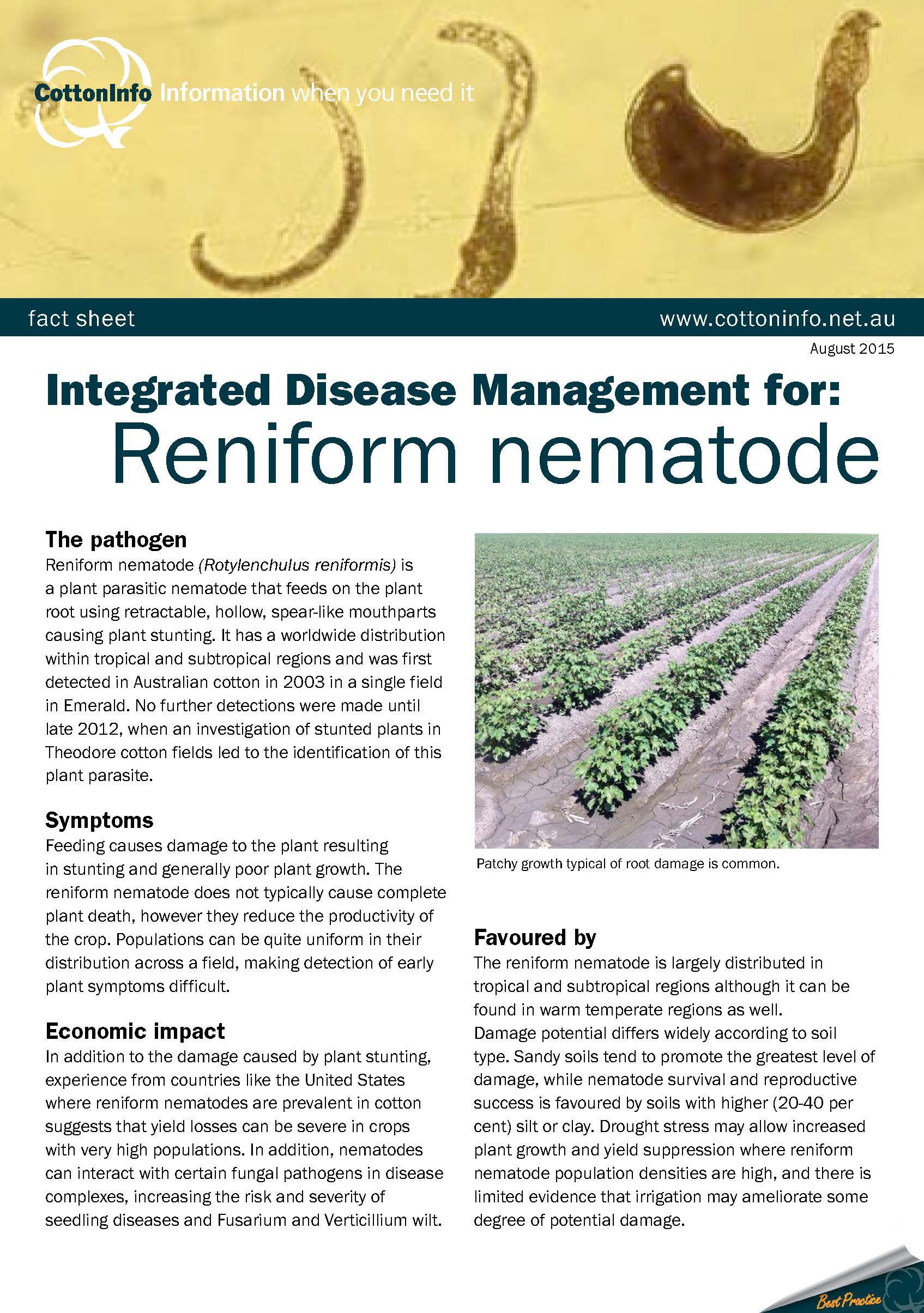 This fact sheet, one of the CottonInfo Integrated Disease Management (IDM) fact sheets series, looks at the IDM strategies to control reniform nematode.