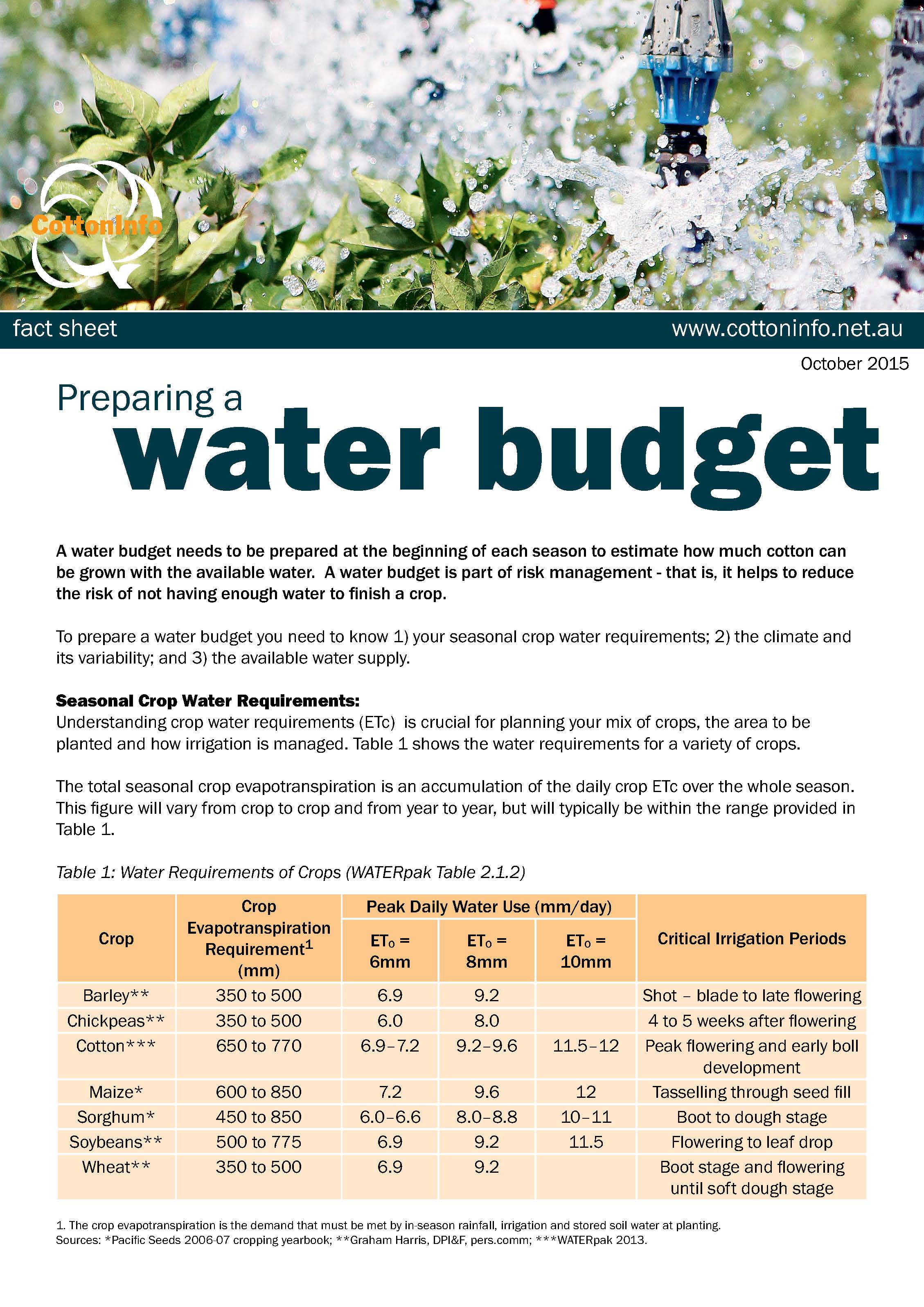 A water budget needs to be prepared at the beginning of each season to estimate how much cotton can be grown with the available water. A water budget is part of risk management - that is, it helps to reduce the risk of not having enough water to finish a crop.