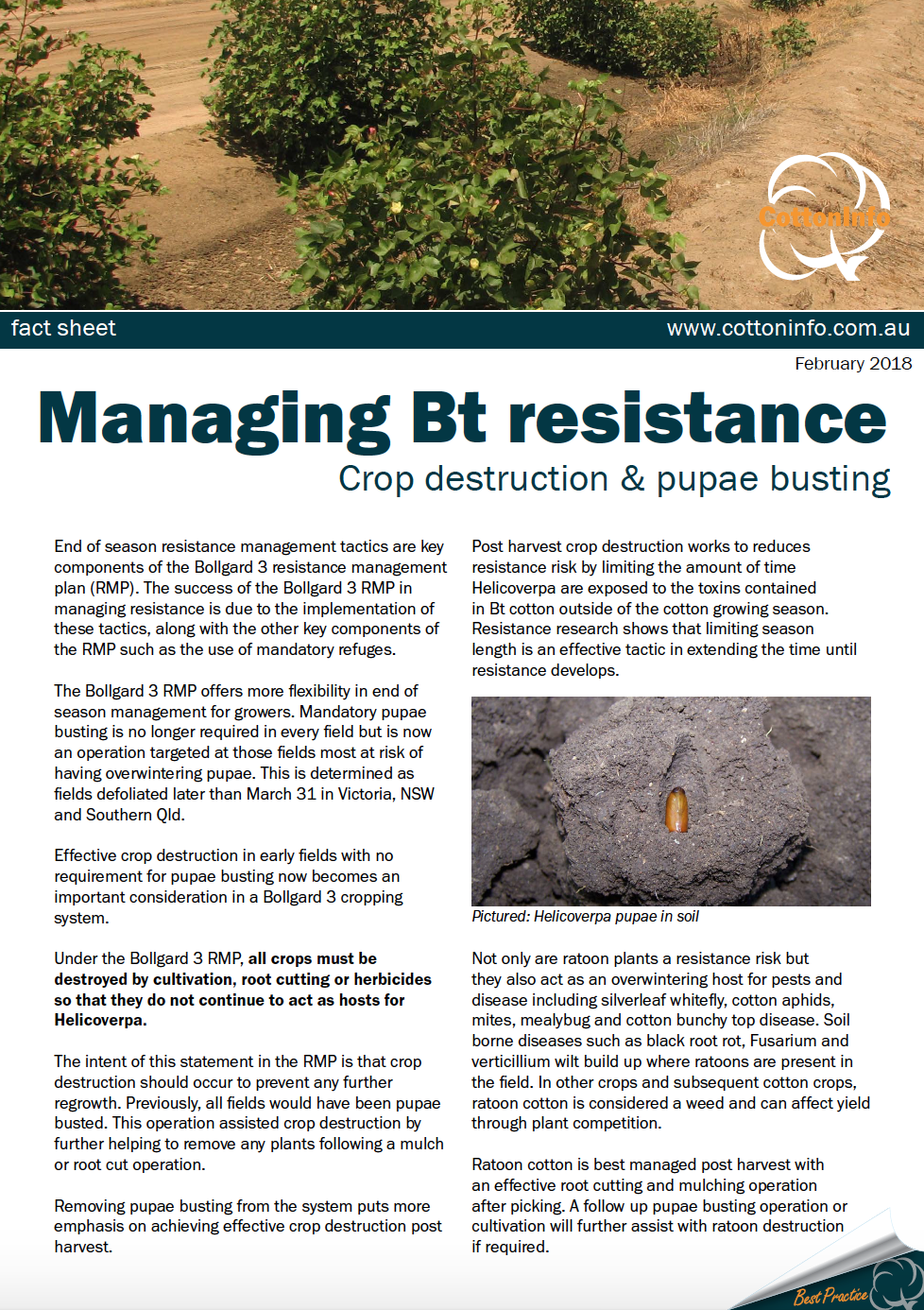 This fact sheet outlines the importance of crop destruction and pupae busting in managing resistance risk in Bt cotton.