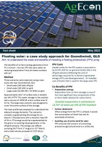 This fact sheet looks at the costs and benefits of installing a floating photovoltaic (FPV) array. Three scenarios are explored using a case study site near Goondiwindi, QLD.