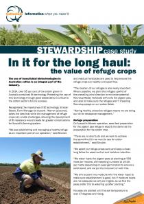 The use of insecticidal biotechnologies in Australian cotton is an integral part of the industry. In 2014, over 95 per cent of the cotton grown in Australia contained Bt technology. Protecting the use of this technology through good stewardship is critical to the cotton sector’s future success - as this case study, which focuses on Auscott Warren (part of the CottonInfo case study series) outlines.